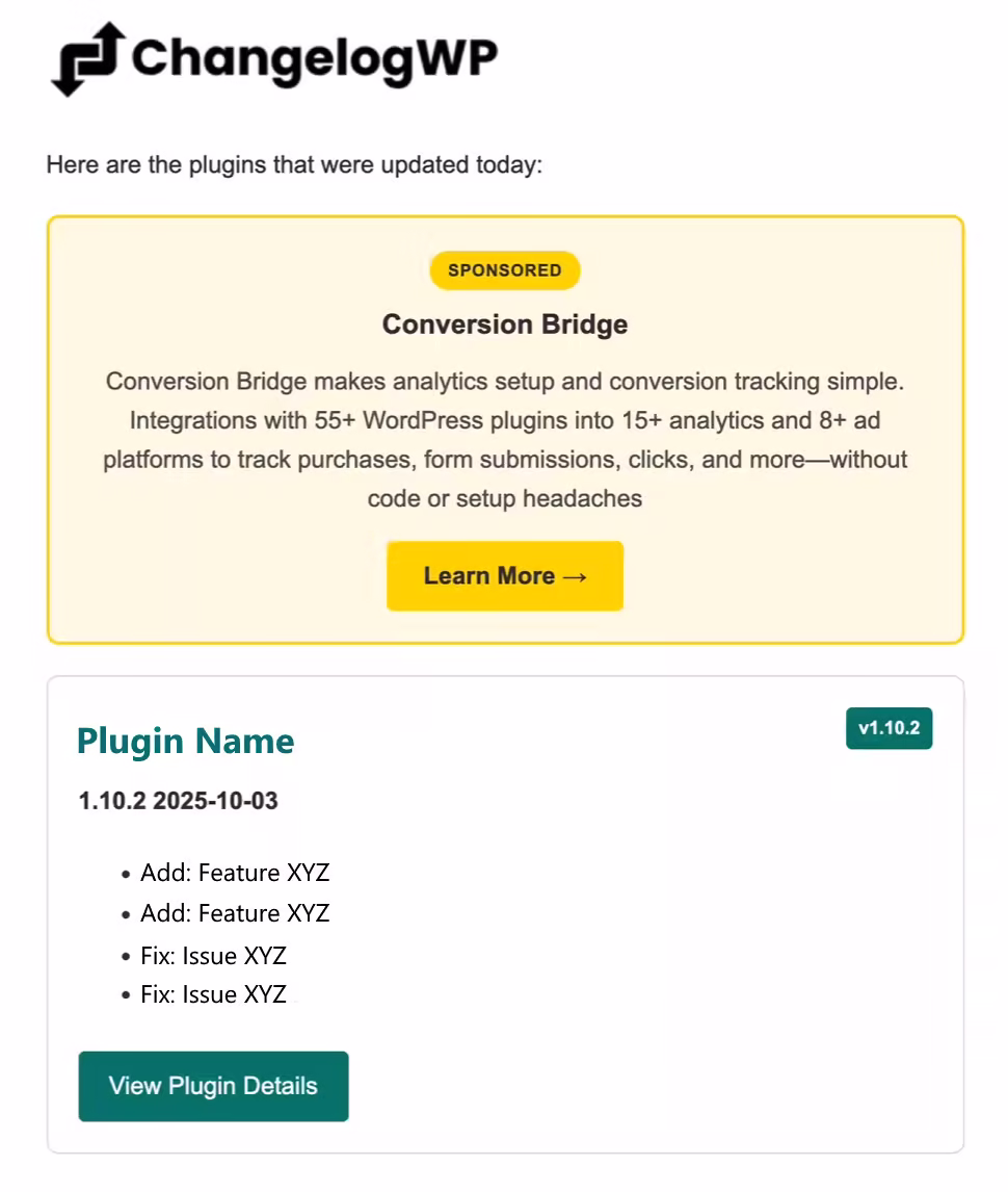 Extend customer reach by having your company, product, or service added to changelog email notifications. Sponsor Advertisement Example